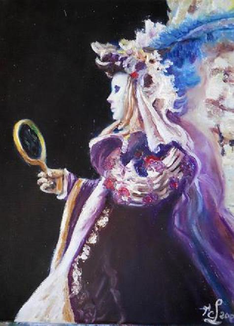 Huile sur toile 5 F (35/27) 2003. Masque richement vêtu, tenant un miroir, est adossé à un mur. Le personnage se détache sur fond sombre faisant ressortir les couleurs de son costume.