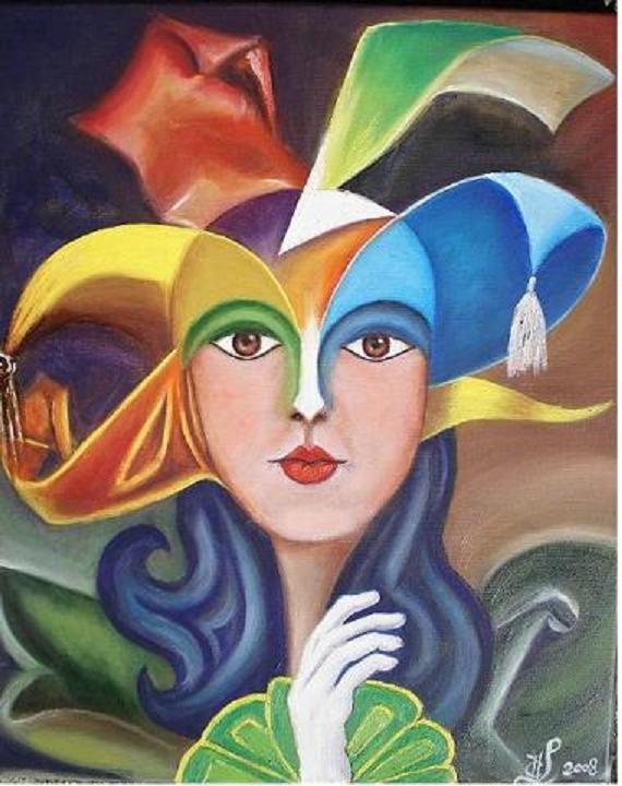 Huile sur toile 8 F (46/38) 2008. Oeuvre très colorée utilisant les couleurs primaires: rouge, bleu, jaune ainsi que leurs complémentaires. La gamme de l'arc en ciel est ainsi complète.