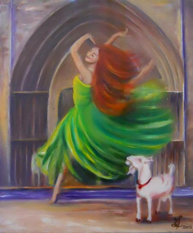 Huile sur toile10 F (55/46) 2005. Héroïne du roman de Victor Hugo, Esméralda effectue une dans échevelée sur la parvis de Notre Dame de Paris sous les yeux de sa chèvre.