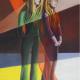 Huile sur toile 12 P (61/46) 2005. Masque de carnaval portant coiffe à la turque, tient un éventail, quelques gondoles se cotoient. La Basilique St Marc dorée par les rayons du soleil couchant.