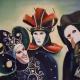 Huile sur toile. 2003. Crépuscule sur Venise. Sur la lagune, reflets du coucher du soleil, 2 gondoles à moitié cachées par un Pierrot arborant une collerette blanche et transparente