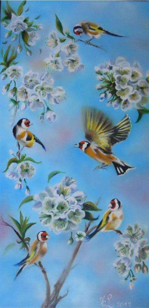Chardonnerets et cerisier en fleurs