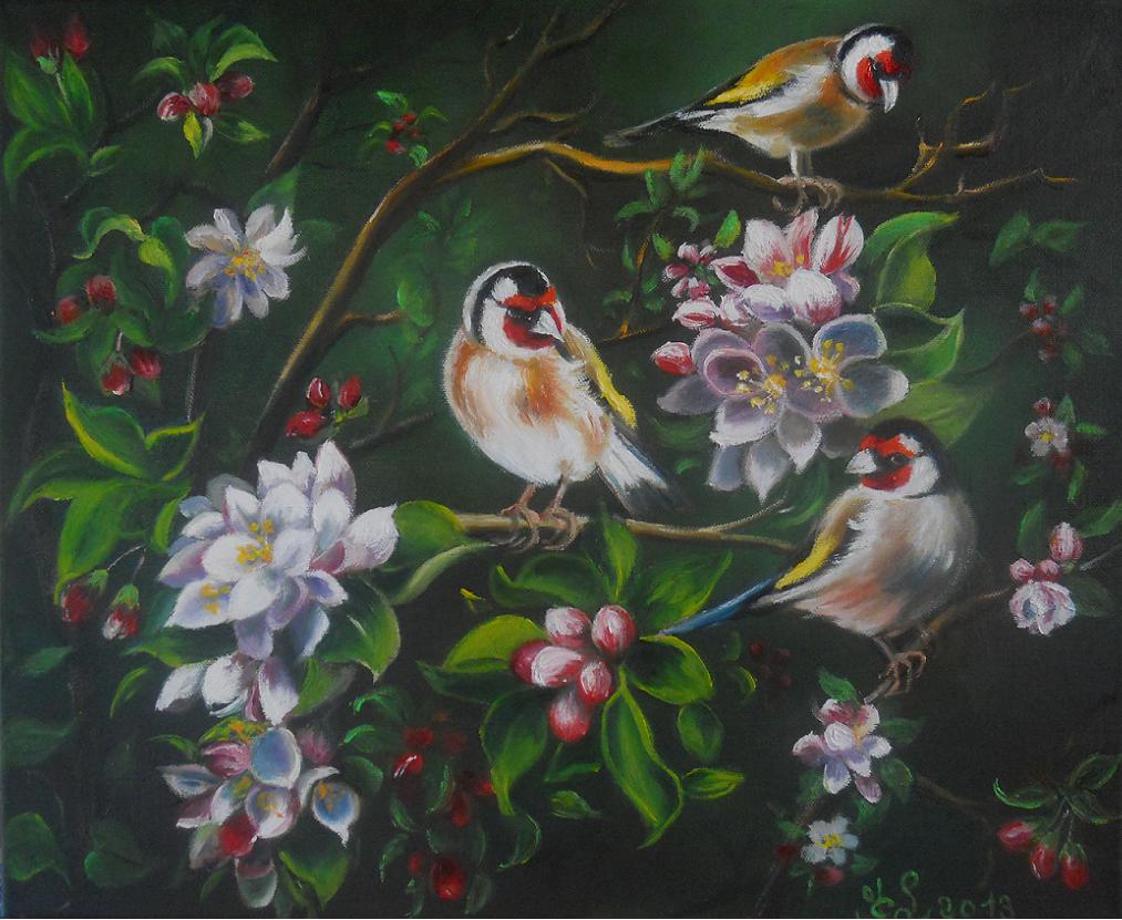 Huile sur toile 8 F (38/46) réalisée au pinceau en 2013. Chardonnerets sur ceriser en fleurs