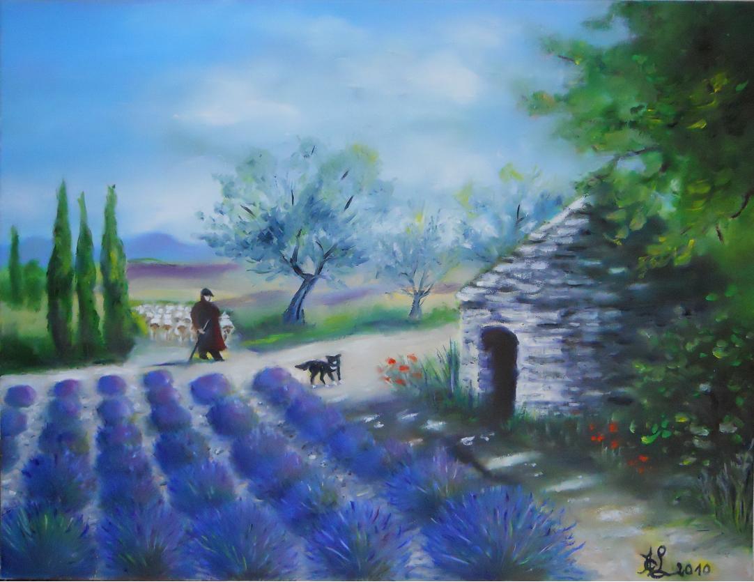 Huile sur toile 15 P (50/65) 2010. Promenade en Provence, borie noyée dans la végétation face à un champ de lavandes. Le chemin dirige l'oeil du spectateur vers un berger et son troupeau.