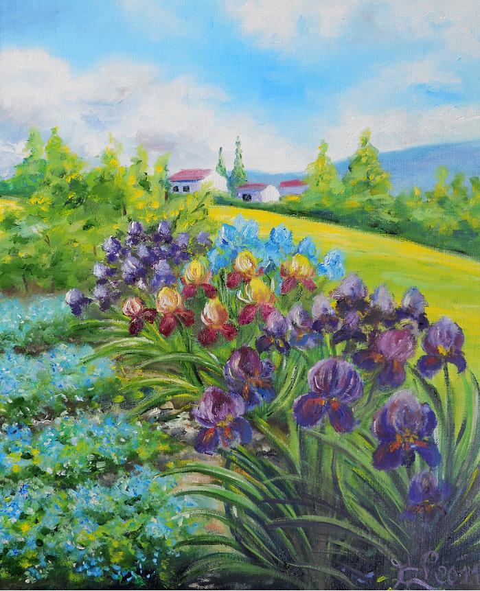 Huile sur toile 8 F (38/46) 2011. En Mai explosion de couleurs et floraison de toutes sortes. Une rangée de majestueux iris cotoie un parterre de modeste myosotis dans un décor campagnard.