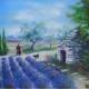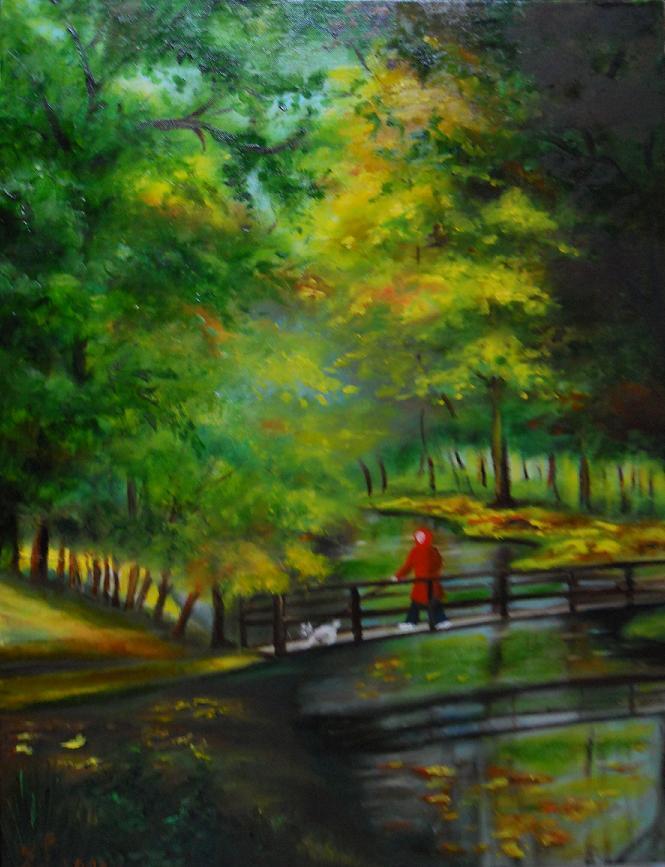 Huile sur toile 15 P (50/65) 2010. Forêt aux couleurs automnales, un petit pont de bois enjambe un cours d'eau. Le pont est traversé par une promeneuse emmitouflée dans un manteau rouge, elle tient en laisse un petit chien blanc.