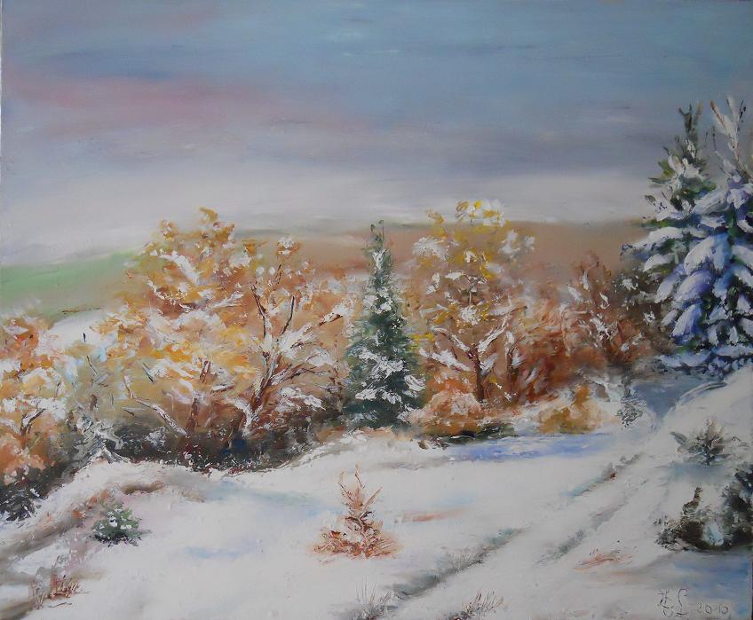 Huile sur toile 10 F (55/46)2010. Sentier traversant un champ enneigé Des feuillus ont conservé leurs couleurs d'automne, conifères ployant sous la neige. Le ciel aux couleurs froides est brumeux.