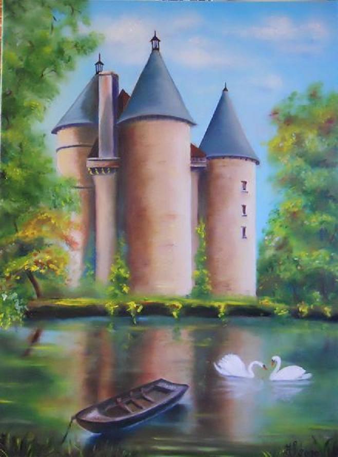 Huile sur toile 20 P (73/54) 2010. Château médiéval et ses 3 tours rondes coiffées d'ardoise, cerné par les arbres du parc. L'ensemble se reflète dans les eaux des douves. Une barque amarrée, un couple de cygnes évolue sur l'eau.