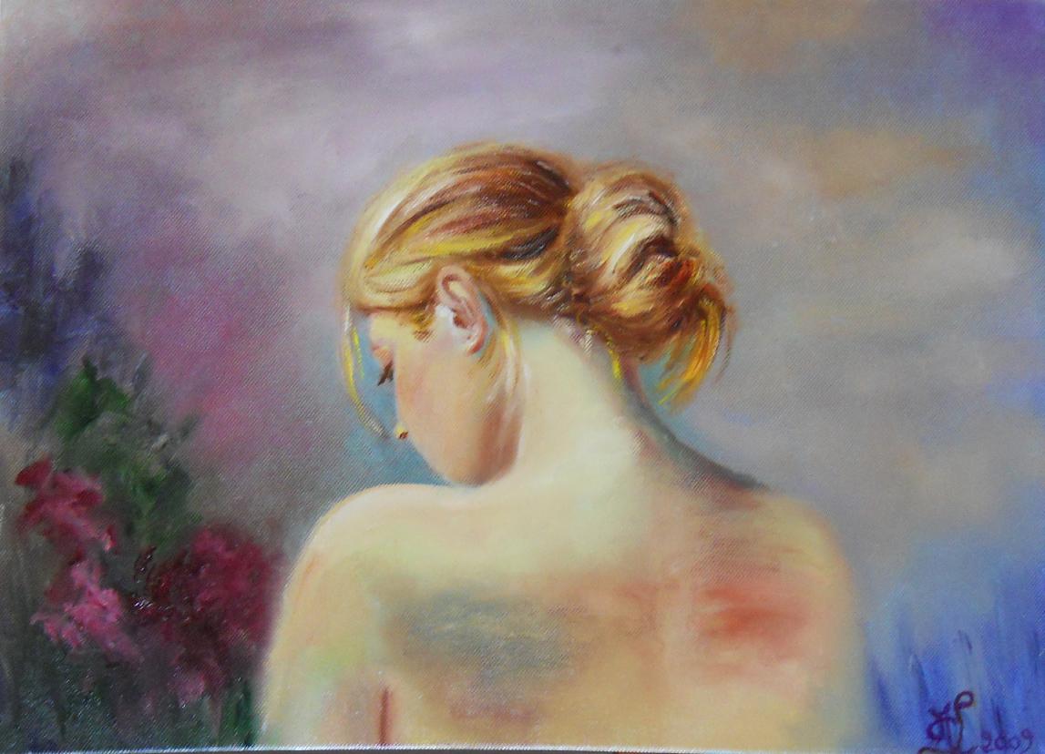 Huile sur toile 8 P (46/33) 2009. Tracé harmonieux d'une nuque légèrement inclinée mise en valeur par les cheveux relevés en chignon rapidement bâti.