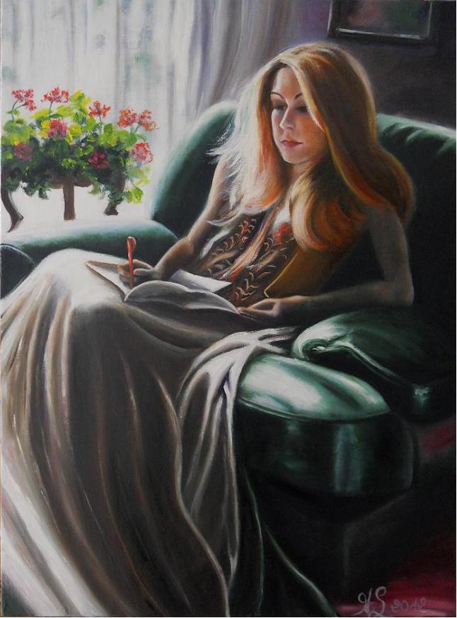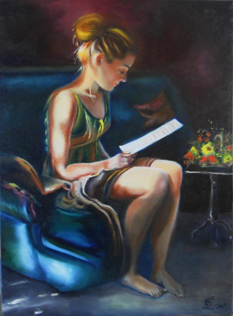 Huile sur toile 20 P (73/54) réalisée en 2009. Ma fille cadette, lectrice passionnée dans une attitude qui se veut romantique.