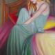 Huile sur toile 20 P (73/54) 2009. Ambiance intimiste dans les tons de violet et rose. Jeux de transparence de la robe laissant entrevoir les jambes du personnage.